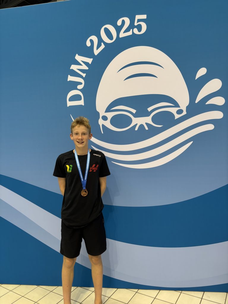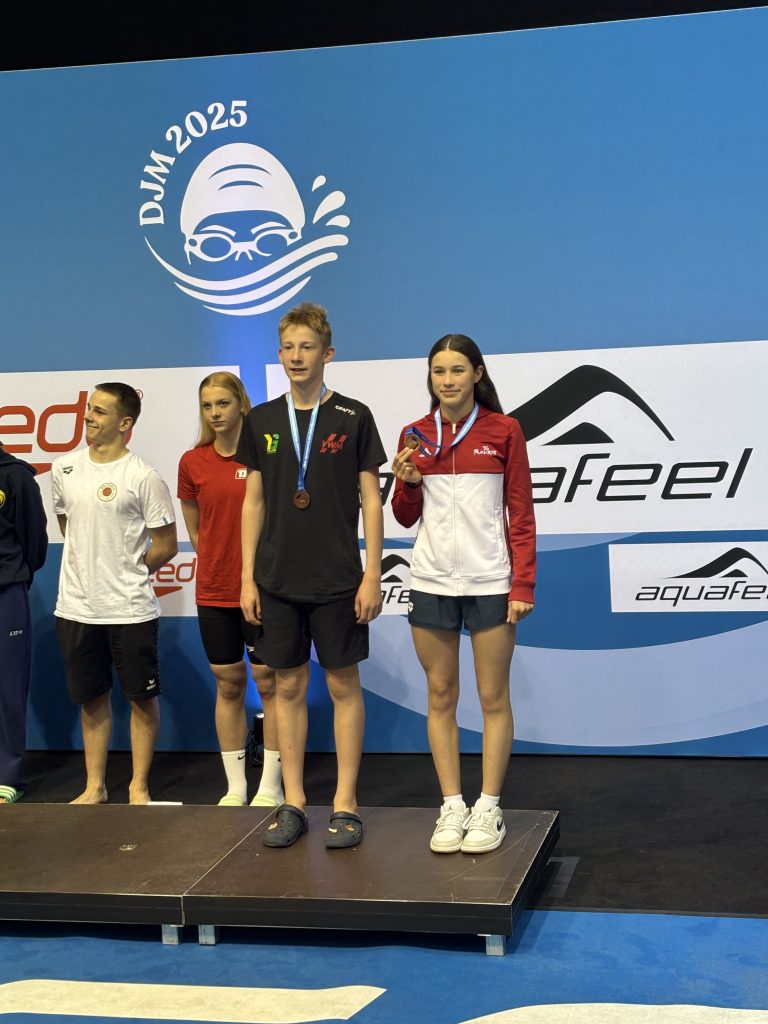 Am Donnerstag dann Valentins Lieblingsstrecke: 50 m Schmetterling. Und tatsächlich – er zog ins Finale ein und holte sich mit einem starken Rennen die Bronzemedaille! Für Nell reichte es über die gleiche Strecke ganz knapp nicht fürs Finale – ihr fehlten fünf Hundertstel zu Platz 8. Kyrylo hatte an diesem Tag seinen ersten DJM-Start über 200 m Rücken und zeigte direkt ein sauberes Rennen auf nationalem Topniveau.