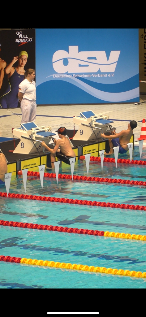 Schon am Mittwoch ging’s los mit den 100 m Freistil für Nell und Valentin, sowie 200 m Schmetterling für Valentin. Nell schwamm als 8. Schnellste ins 100 m Freistil-Finale und Valentin als 7. Schnellster ins 200 m Schmetterling-Finale – beide mit neuen Bestzeiten. Also hieß es für uns: zurück ins Hotel, Mittagessen, ausruhen, Energie tanken. Am Nachmittag ging’s wieder in die Halle. Nach dem Einschwimmen stand zuerst Valentins 200 m Schmetterling an. Er verbesserte seine Zeit erneut deutlich – insgesamt um 7 Sekunden – und wurde starker Sechster in Deutschland. Danach kam Nell an die Reihe: Sie legte ein packendes Rennen über 100 m Freistil hin, schwamm eine neue Bestzeit von 1:00,03 Minuten und verpasste damit die magische 1-Minute-Marke um gerade einmal vier Hundertstelsekunden – was für ein Rennen! Am Ende bedeutete das Platz 5 in einem hochklassigen Teilnehmerfeld. Klasse Leistung!