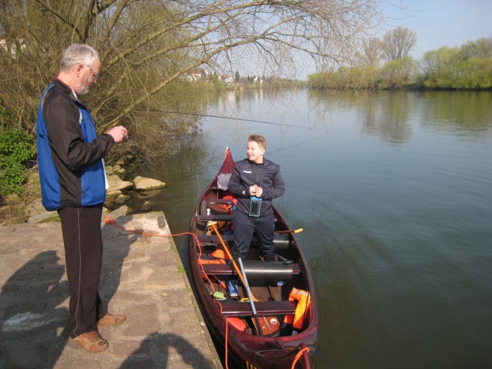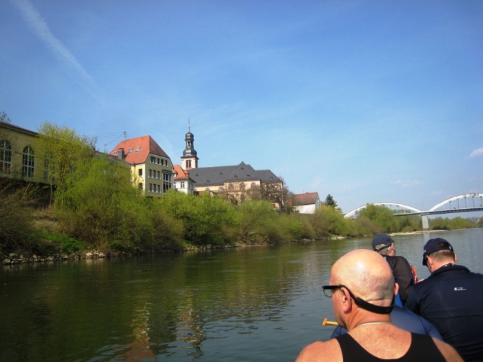 Kaum wieder Wasser unterm Kiel, mussten wir einem auf Steinen festgefahrenen Kanuten aus der Patsche helfen, der sich dafür vielfach bedankte. Nun ging es so richtig ab, denn unterhalb des Wehres machte der Neckar seinem keltischen Ursprungsnamen alle Ehre, nämlich: Heftig, böse, schnell. Die Anforderungen an den Steuermann (PP) waren entsprechend und ohne die tatkräftige Steuerhilfe von Gerd im Bug wäre es schlecht möglich gewesen die Strecke zu bewältigen. Nach jeder Biegung war die Situation eine andere und immer wieder mussten wir eine Durchfahrt suchen die ausreichend Wasser für unseren Großkanadier vorhielt. Bald war nun Schloss Seckenheim in Sicht und kurz darauf, hinter der Brücke Ilvesheim-Seckenheim, wurde das letzte Wildwasser durchfahren. Dabei hatten wir alle viel Spaß, denn dort waren die Wellen besonders kurz und hoch. Dank GPS konnte die Max. Geschwindigkeit von 12,6 Km/h ermittelt werden.