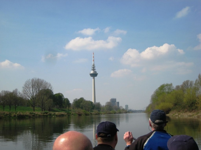 Nach der Mittagspause ging es gemütlicher weiter, so wie der Neckar, der auf der Hausstrecke der dort ansässigen Rudervereine sich recht zahm verhält. Nach passieren des Fernmeldeturmes, der Neckaruferbebauung und unseren Mannheimer Neckarbrücken, stiegen wir bei Stromkilometer 1 an Land um das legendäre Kuchenbuffet der Mannheimer Kanugesellschaft zu testen. Bei herrlichem Sonnenschein und angenehmen Temperaturen ließ es sich hier wunderbar bei Kaffee und Kuchen sitzen. Die Kuchen und Torten waren wieder einmal einsame Spitze und bald mussten zusätzliche Tische und Bänke aufgestellt werden.