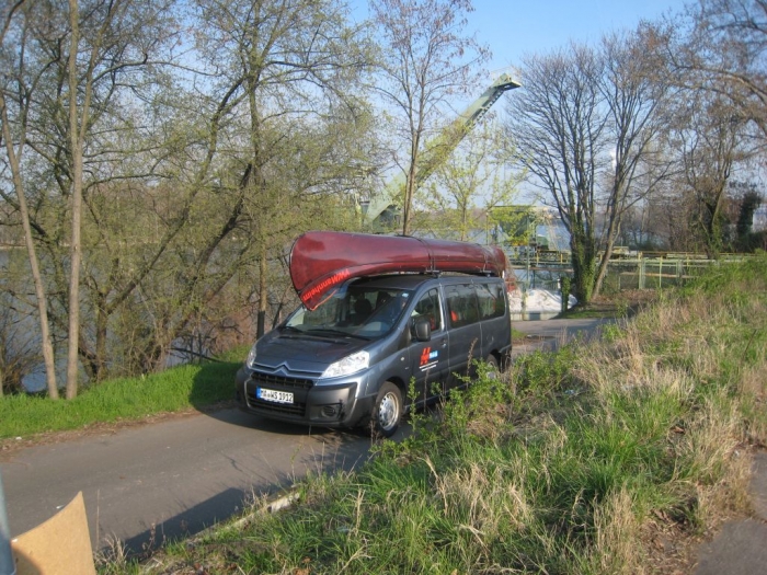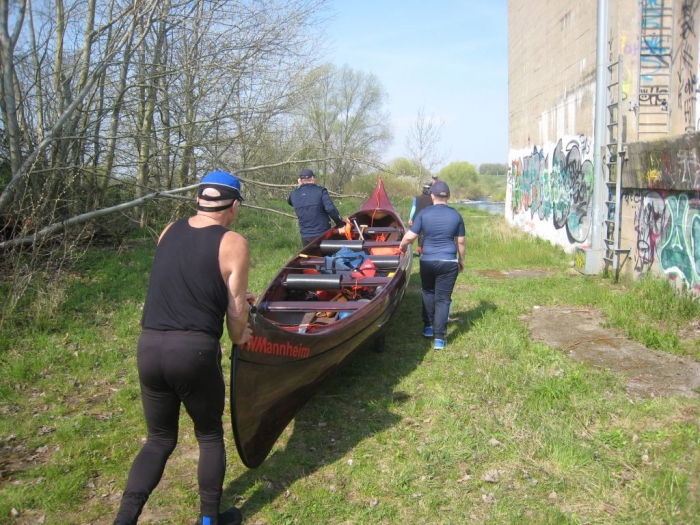 Die Fahrt ging an der Fähre Ladenburg-Neckarhausen vorbei bis zum Wehr Ladenburg, wo wir entscheiden mussten, Paddeln wir im langweiligen Kanal oder im ehemaligen naturbelassenen Flussbett. Da das alte Flussbett genügend Wasser führte, haben wir uns entschieden, es erstmals mit einem großen Kanadier zu befahren. Doch zunächst mussten wir erst einmal das Wehr umgehen. Trotz mitgeführtem Bootswagen war die ca.-300 m Landpassage und das Einsetzen hinter dem Wehr ein ordentliches Stück Arbeit.