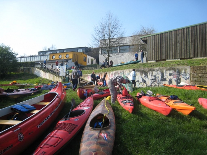 In der Folgezeit füllte sich die Neckarwiese zusehends mit Teilnehmern und allerlei Bootstypen. Vom Kinderspaßboot, über zahlreiche Einer-und Zweierwanderboote, bis Einer und Dreierkanadiern, sowie 2 weiteren Mannschaftskanadiern war alles dabei. Lag es am schönen Wetter oder an der zunehmenden Beliebtheit der Veranstaltung, denn gegen 11:00 war die Wiese voll. Nach Begrüßung und einem dreifach kräftigen Ahoi, konnten Wandersportwart Gerhard Maier und Alois Danzer vom TV-Edingen die ungeduldig wartenden Teilnehmer (ca.-80) aufs Wasser entlassen.