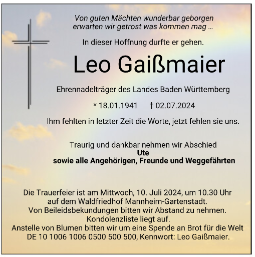 und Ehrenvorsitzende Leo Gaißmaier, im Alter von 83 Jahren verstorben.