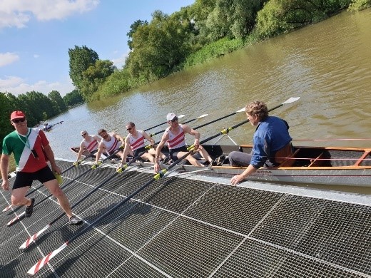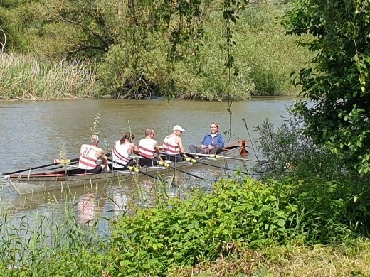 Sieben Kilometer auf dem Altrhein, 6 Kilometer auf dem Rhein gegen die Strömung und wieder 10 Kilometer zurück auf dem Altrhein – 23 km im Gigboot. Das ist die Bilanz der vier wackeren Ruderer plus einem Steuermann am Ende des Tages.