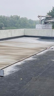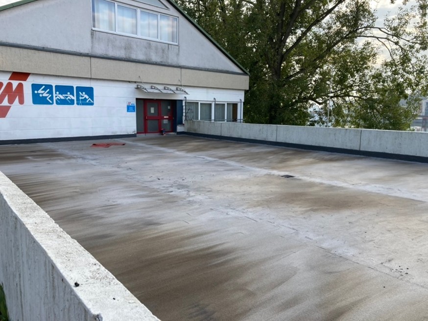 Die Deckschicht der Teilüberdachung bestand aus verstärktem Estrichbeton mit zwei darunter liegenden Dichtbahnen. Der Beton hatte zwar ebenfalls Dehnungsfugen, dazwischen hatten sich aber zahlreiche Risse gebildet und im Bereich des Wasserablaufes zerbröselte er bereits.