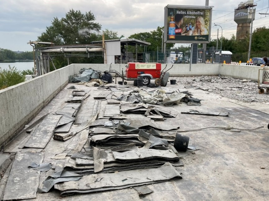 Darunter befand sich eine doppelte Schicht Bitumenbahnen als Dichtung, die abgeschält und entsorgt werden musste.