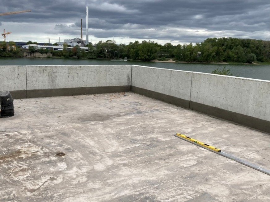 Der Deckenaufbau im Bootshaus besteht aus zwei großen Stahlbetonplatten, die auf Pfeilern aufliegen. Einmal als Bootshallendecke und einmal als Teilüberdachung des Bootshof. Dazwischen ist eine Fuge, die verhindert, dass durch temperaturbedingte Ausdehnung und Schrumpfung Spannungsrisse entstehen. Die Fuge ist wiederum nach oben elastisch abgedichtet.