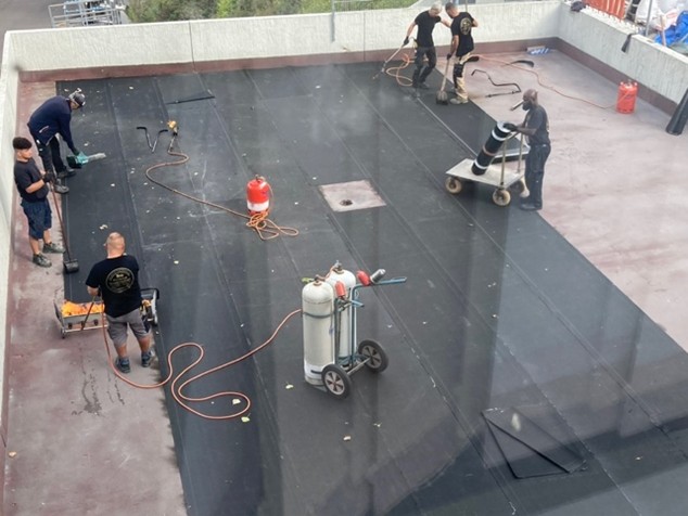 Anschließend wurden Dichtbahnen aus Bitumen heiß aufgeklebt und angewalzt.