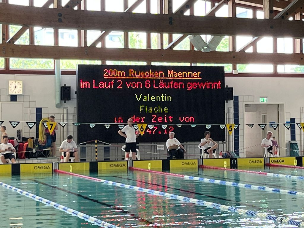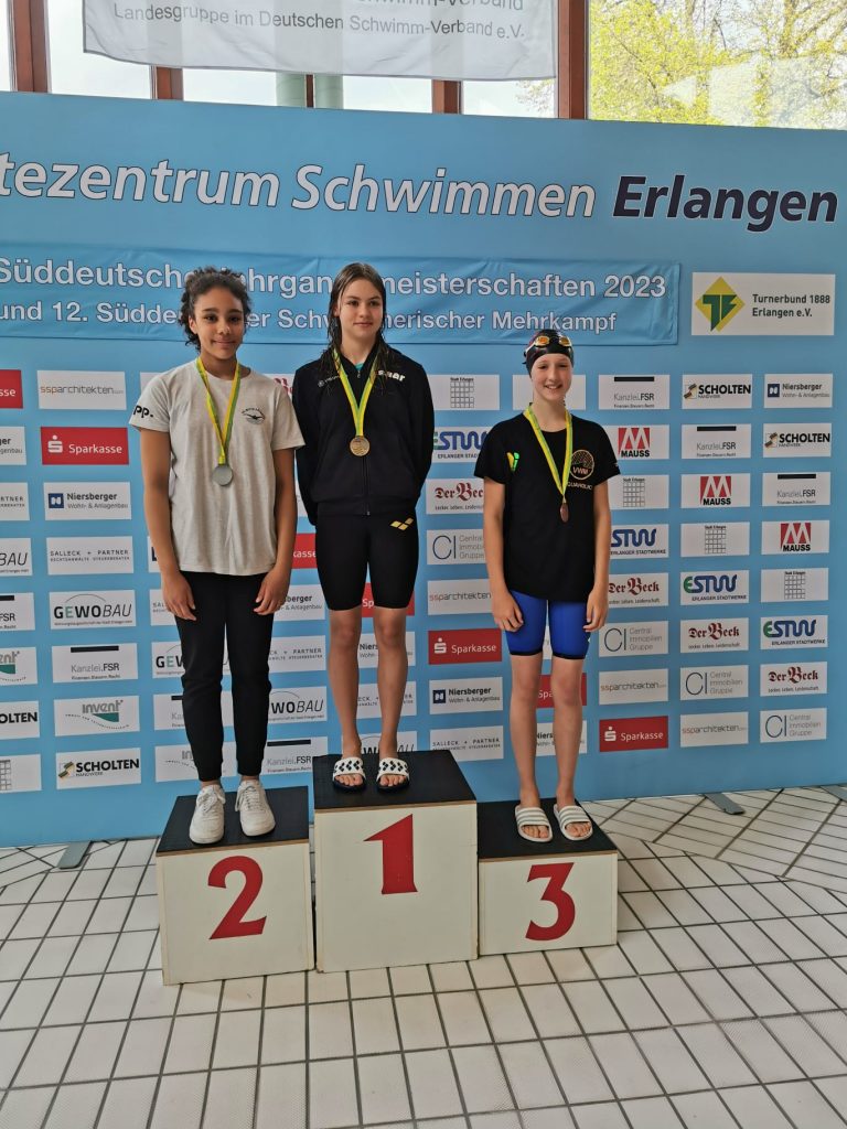 Tino (2012) und Nell (2011) haben es beide geschafft und durften zusammen mit Nell`s Papa Jelle und Trainer Sebastian übers Wochenende nach Erlangen fahren, um dort mit den besten Schwimmern Süddeutschlands ihrer Altersklasse zu kämpfen. Tino durfte aufgrund seines Alters im Mehrkampf antreten, das heißt 5 Starts in 2 Tagen, darunter 200m Lagen, 400m Kraul, und da er sich für den Rückenmehrkampf angemeldet hat 100m und 200m Rücken, sowie 50m Rücken Beine. Für jede Strecke sammelte er Punkte, die am Ende zusammengerechnet werden und so das Podest bestimmen. Tino lieferte sich einen heißen Kampf mit seinen Konkurrenten und konnte am Ende über alle 5 Strecken hinweg die meisten Punkte sammeln. Somit wurde er Süddeutscher Jahrgangsmeister im Rücken Mehrkampf, eine herausragende Leistung!