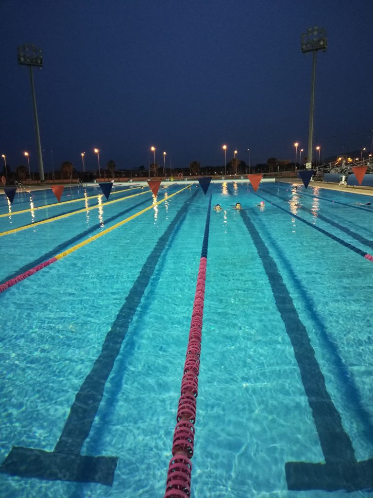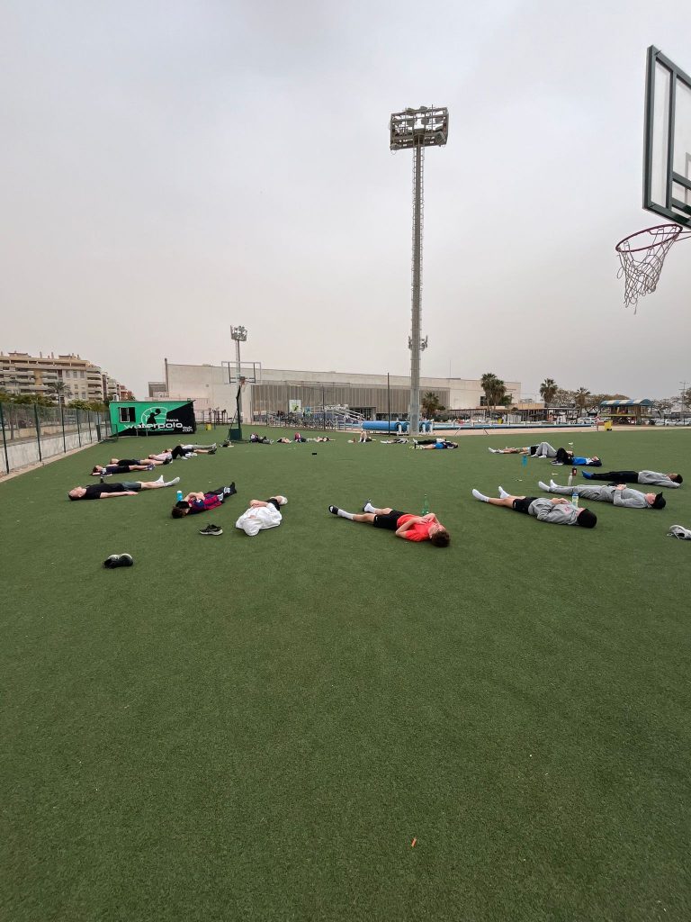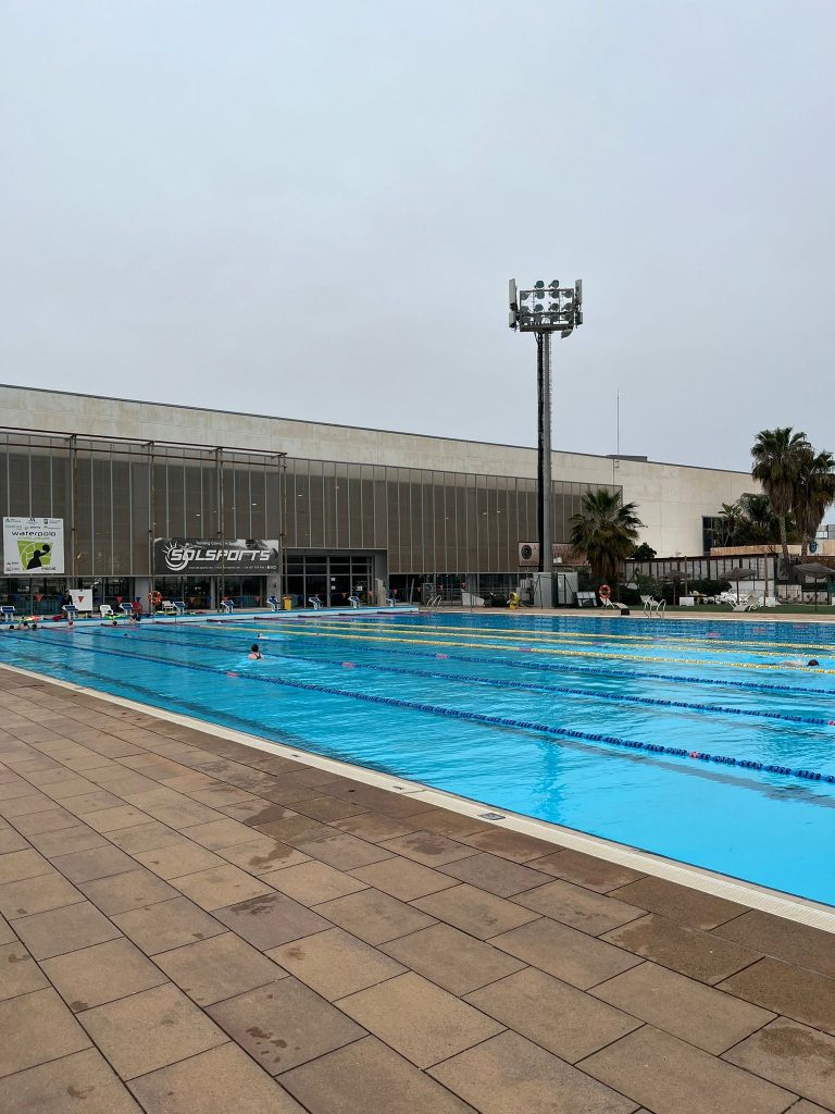 Diejenigen, die dachten, wir würden uns erst einmal ausruhen, weil wir kaum Schlaf hatten, merkten schnell, dass das Trainingslager begonnen hatte. Nach dem Mittagessen starteten wir direkt mit der ersten Trainingseinheit. Das Personal von SolSport empfing uns herzlich und zeigte uns die beeindruckende Anlage mit einem 50-Meter-Indoor- und Outdoor-Pool sowie großen Freiflächen für das Athletiktraining. Von 16:30 bis 18:00 Uhr stand dann die erste Athletik- und Krafteinheit auf dem Programm, bevor wir um 18:00 Uhr in das angenehm warme Wasser eintauchten. Die Einheit war fantastisch, denn wir hatten alle zehn Bahnen für uns und konnten das Training voll auskosten, während die Sonne über Malaga unterging.