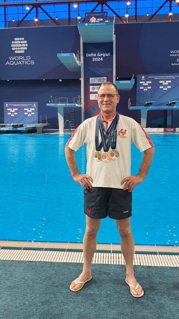 Vom 23.02.2024 bis 03.03.2024 fanden die World Aquatics Masters Championship in Doha statt. Wir Wasserspringer durften unser Können vom 23.02.2024 bis 27.02.2024 im Hamad Aquatic Center unter Beweis stellen. Die Tatsache wieder an einer Weltmeisterschaft teilnehmen zu dürfen und auch zu können, war schon überwältigend. Als ich, Simon Jentsch vom VWM Mannheim, das Teilnehmerfeld sah waren meine Erwartungen: „Wenn ich unter die ersten 10 komme, bin ich mein persönlicher Weltmeister!“. Insgeheim spekulierte ich allerdings doch damit, irgendwie unter die ersten 5 zu kommen. Mein Trainer Uwe Weiss und ich reisten bereits am 21.02. an, um uns bereits gleich am folgenden Tag die Sprunganlage anzuschauen und eine erste Trainingseinheit zu absolvieren.
